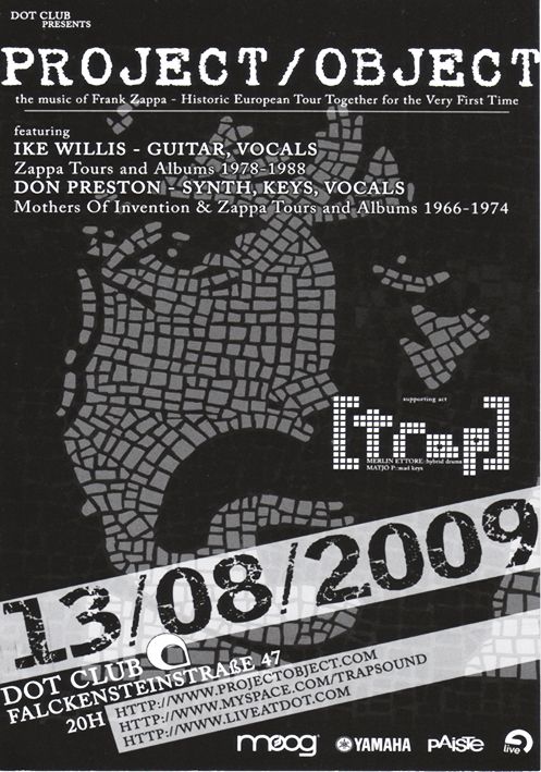 Wir hatten die große Freude und Ehre den Live-Sound der legendären Zappa-Band Project Object aus New York bei ihrem Auftritt im Berliner Dot-Club am 13.08.2009 zu betreuen. Project Objekt sind mit Ike Willis, Don Preston aus der Originalbesetzung der Mothers of Invention ein absolutes Highlight in Sachen Zappa-Sound.